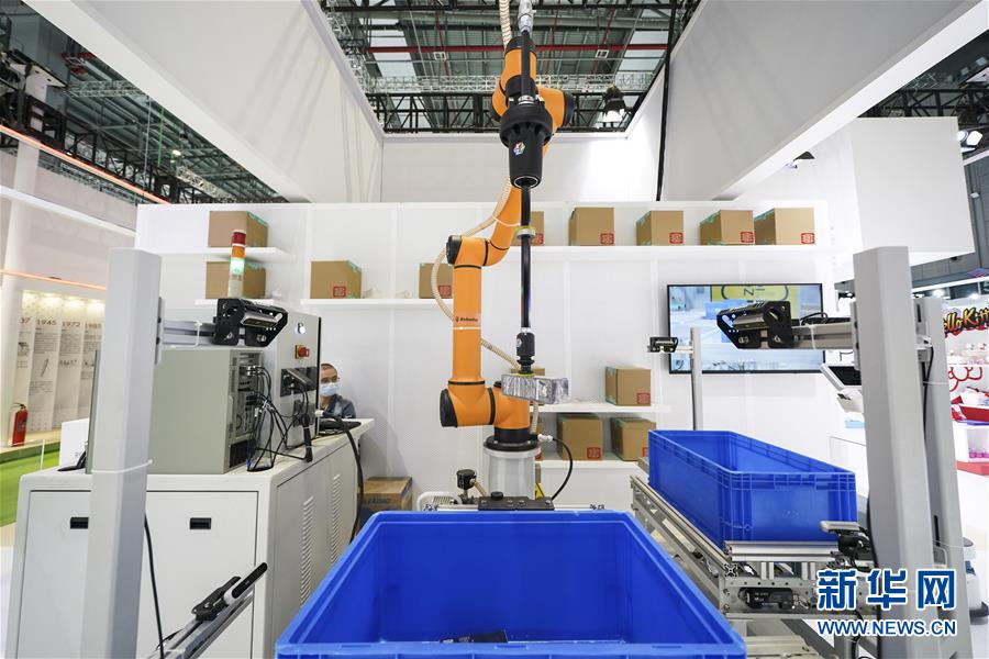 11月5日在第三屆進博會服務(wù)貿(mào)易展區(qū)拍攝的物流分揀機器人。新華社記者 張豪夫 攝