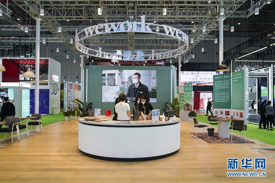 11月5日拍攝的第三屆進博會服務(wù)貿(mào)易展區(qū)wework展臺。 新華社記者 張豪夫 攝