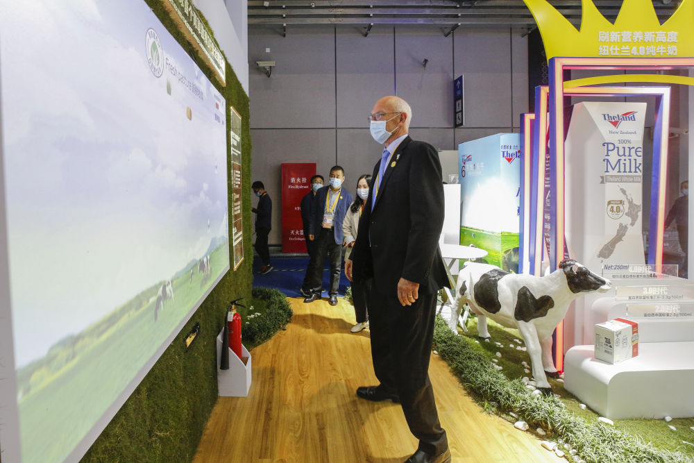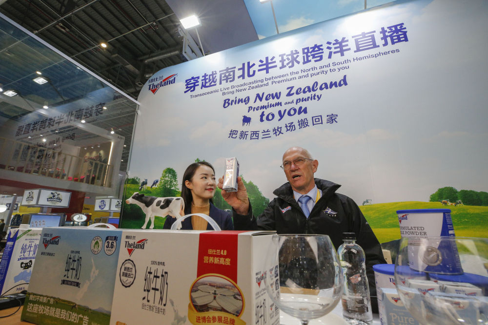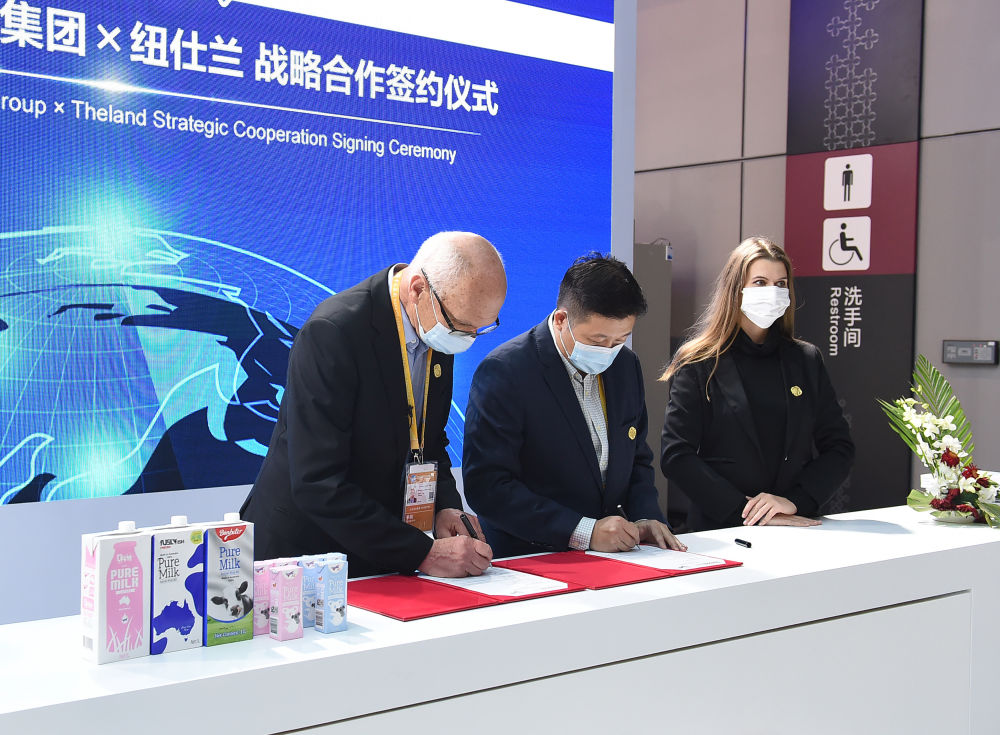 11月5日,羅伊(左一)在進博會上的紐仕蘭乳業(yè)展臺參加簽約儀式。
