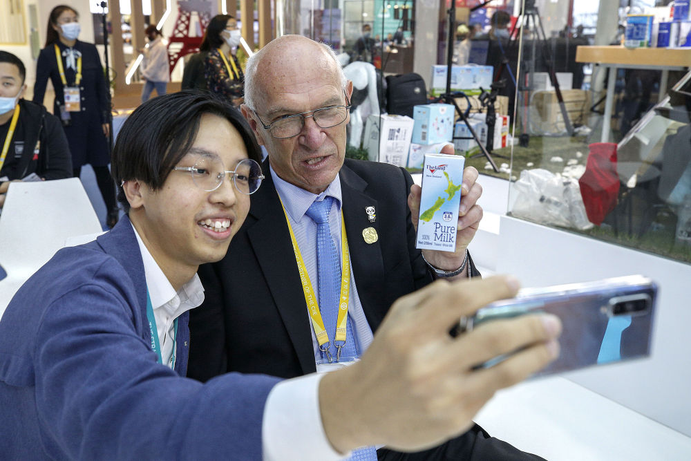 11月7日,羅伊(右)在第三屆進博會紐仕蘭乳業(yè)展臺和粉絲合影。