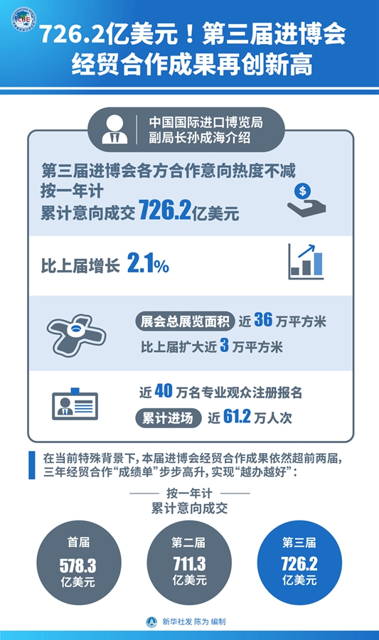 圖表:726.2億美元!第三屆進博會經(jīng)貿(mào)合作成果再創(chuàng)新高 新華社發(fā) 陳為 編制