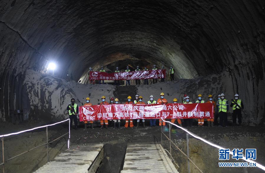 11月15日,施工人員在印度尼西亞西爪哇省慶祝雅萬高鐵7號隧道貫通。新華社發(fā)(祖卡南 攝)