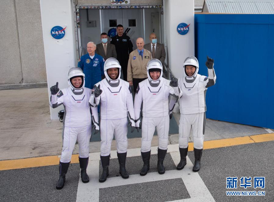 這是11月15日在美國(guó)佛羅里達(dá)州肯尼迪航天中心拍攝的參與這次代號(hào)“Crew-1”航天任務(wù)的宇航員香農(nóng)·沃克,維克托·格洛韋爾,邁克爾·霍普金斯,和日本宇宙航空研究開(kāi)發(fā)機(jī)構(gòu)的宇航員野口聰一(從左至右)。 新華社發(fā)(美國(guó)航天局供圖)