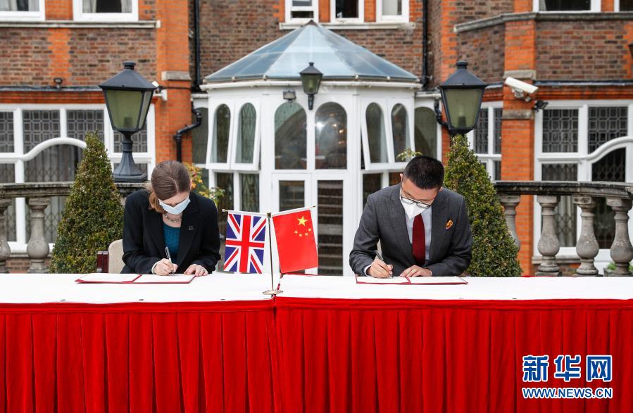 10月16日,在英國(guó)倫敦,代表中國(guó)國(guó)家文物局的中國(guó)駐英國(guó)大使館文化處一秘于果(右)和代表英國(guó)大都會(huì)警察局的探員蘇菲·海斯簽署文物接收確認(rèn)書(shū)。新華社記者 韓巖 攝
