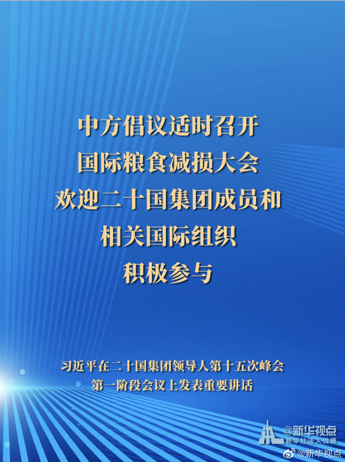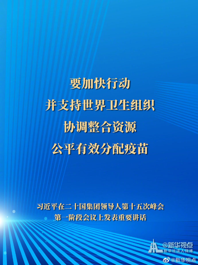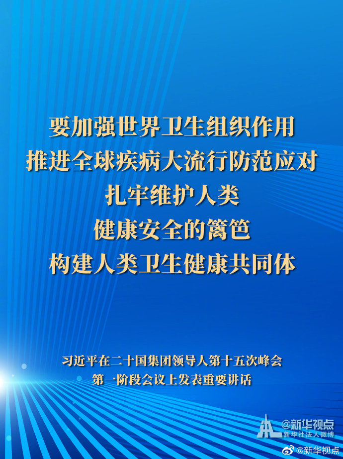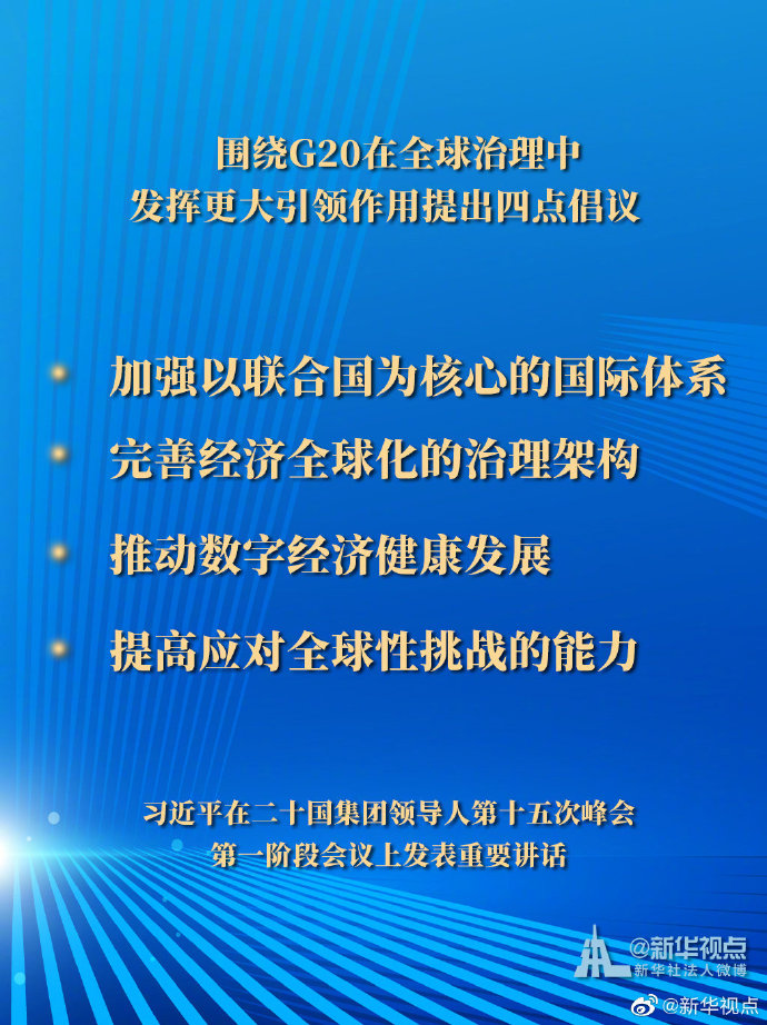 11月21日,國(guó)家主席習(xí)近平在二十國(guó)集團(tuán)領(lǐng)導(dǎo)人第十五次峰會(huì)第一階段會(huì)議上發(fā)表重要講話。一起來(lái)看習(xí)主席的G20金句。