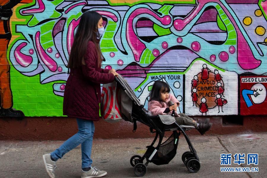 11月21日,在美國紐約,一名女子推著孩子經(jīng)過抗疫宣傳壁畫。美國約翰斯·霍普金斯大學21日發(fā)布的新冠疫情最新統(tǒng)計數(shù)據(jù)顯示,美國累計確診病例超過1200萬例。新華社發(fā)(郭克攝)