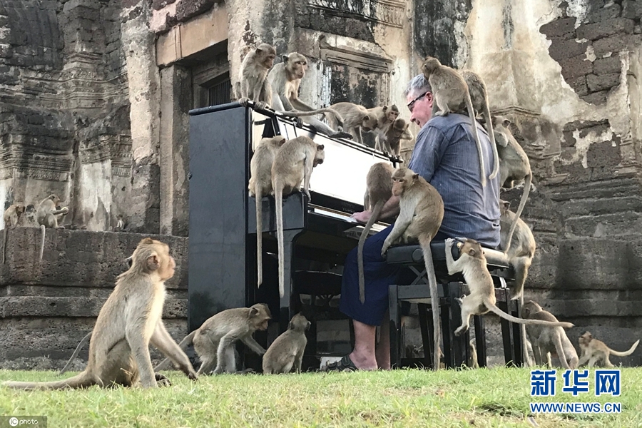 11月21日,泰國華富里府,英國鋼琴家保羅·巴頓(Paul Barton)為一群猴子彈鋼琴。演奏過程中,多只猴子在他周圍跑來跑去,有幾只還爬上了鋼琴,甚至在他的頭頂跳來跳去。巴頓稱,這場特殊的音樂會(huì)旨在引起人們對這群饑餓的猴子的重視。(圖片來源:東方IC)
