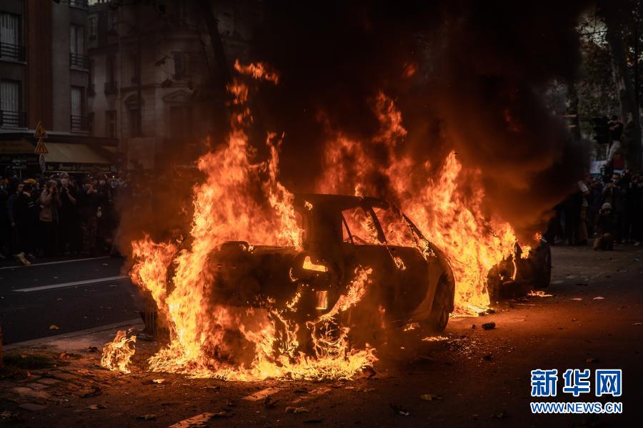 這是11月28日在法國(guó)巴黎拍攝的游行示威中被點(diǎn)燃的車輛。
