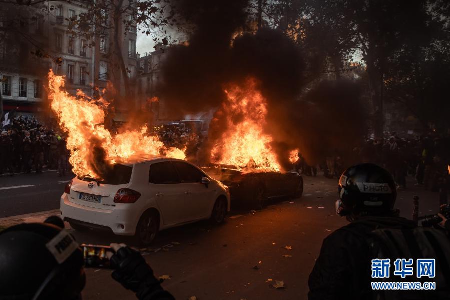 這是11月28日在法國巴黎拍攝的游行示威中被點(diǎn)燃的車輛。