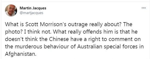 “莫里森的憤怒到底是什么?‘照片’?我想不是。真正令他惱怒的是,他認(rèn)為中國人無權(quán)對(duì)澳大利亞特種部隊(duì)在阿富汗的謀殺行為發(fā)表評(píng)論?!?/font>