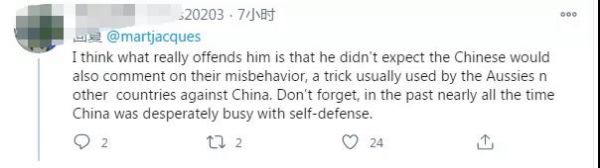 在這條推特下邊,許多網(wǎng)友為馬丁·雅克點(diǎn)贊。其中一位網(wǎng)友說道:“我認(rèn)為真正讓他惱火的是,他沒想到中國人也會(huì)對(duì)他們的不當(dāng)行為發(fā)表評(píng)論,這是澳大利亞人和其他國家對(duì)付中國的慣用伎倆。別忘了,在過去幾乎所有的時(shí)間里,中國都在拼命地進(jìn)行自衛(wèi)?!?/p>