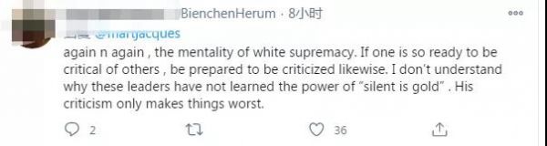 “又一次,白人至上的心態(tài)。如果一個(gè)人準(zhǔn)備好批評(píng)別人,也要準(zhǔn)備好同樣地被批評(píng)。我不明白為什么這些領(lǐng)導(dǎo)人沒有學(xué)會(huì)‘沉默就是金子’的力量。他的批評(píng)只會(huì)讓事情變得更糟?!?/font>