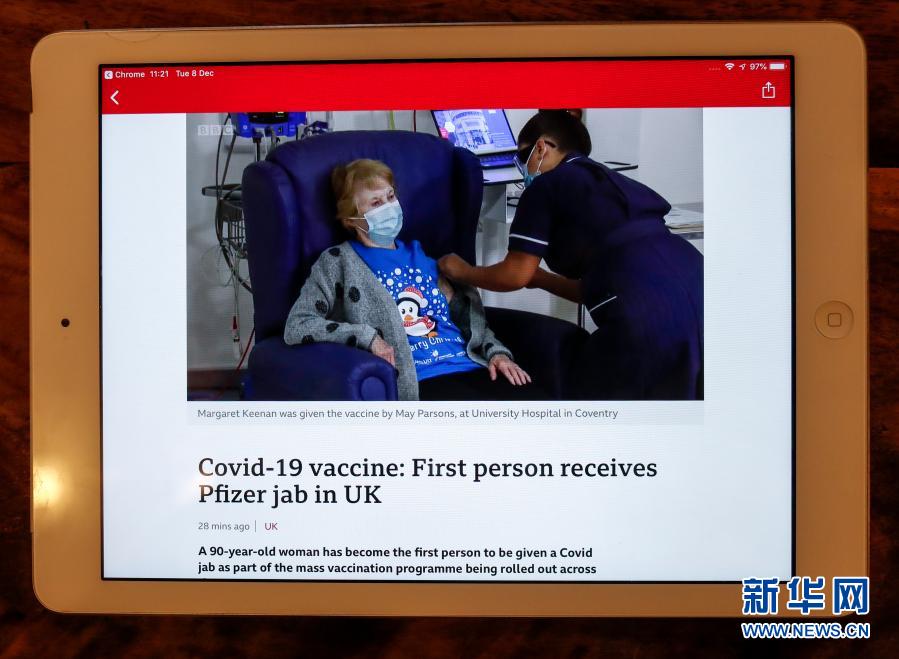 12月8日在英國倫敦拍攝的播放新聞的電腦屏幕顯示,醫(yī)護人員為90歲女子瑪格麗特·基南接種疫苗?,敻覃愄亍せ鲜窃搰孜唤臃N新冠疫苗的人。