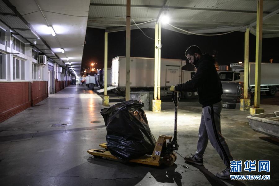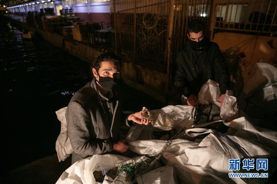 12月17日,在希臘比雷埃夫斯地區(qū)一處港口,阿拉帕基斯(左)與同事一同收集剛從漁船上卸下的塑料垃圾。新華社發(fā)(萊夫特里斯·帕察里斯攝)