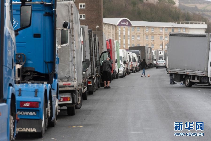 12月22日,在英國多佛,貨車因多佛港關(guān)閉在外排隊。新華社發(fā)(雷伊·唐攝)