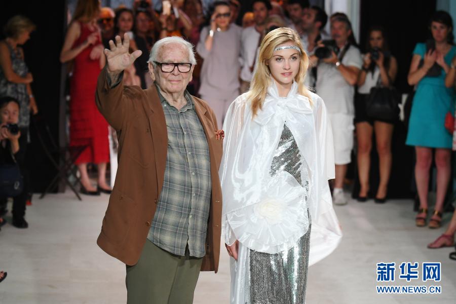 這張資料照片顯示,2016年7月9日,在法國普羅旺斯博尼約舊火車站臨時搭建的秀場里,皮爾·卡丹(左)在時裝秀結束時向觀眾揮手致意。新華社記者李根興攝