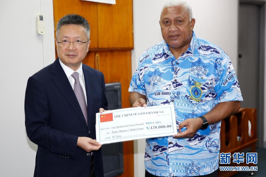 當天在斐濟總理辦公室舉行的儀式上,中國駐斐濟大使錢波代表中國政府向斐濟總理姆拜尼馬拉馬轉(zhuǎn)交了這筆援助款。