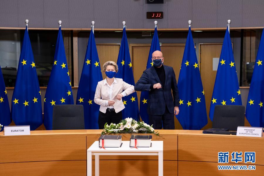 12月30日,在比利時(shí)布魯塞爾的歐盟總部,歐洲理事會(huì)主席米歇爾(右)和歐盟委員會(huì)主席馮德萊恩(左)出席簽署儀式。新華社發(fā)(歐盟供圖)