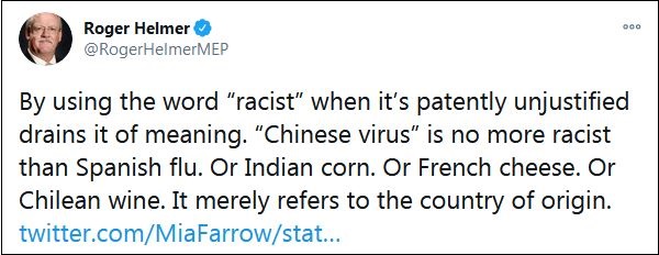 大量網(wǎng)友在他的這條推特下,挖出赫爾默曾經(jīng)發(fā)表的言論。例如早在3月17日,赫爾默就在一條推特中宣稱:“在明顯不合理的情況下,使用‘種族主義’這個詞會讓它失去意義。‘中國病毒’和‘西班牙流感’一樣不是種族主義。就像印度玉米,或法國奶酪,或者智利葡萄酒。它僅僅是指原產(chǎn)國?!?/p>