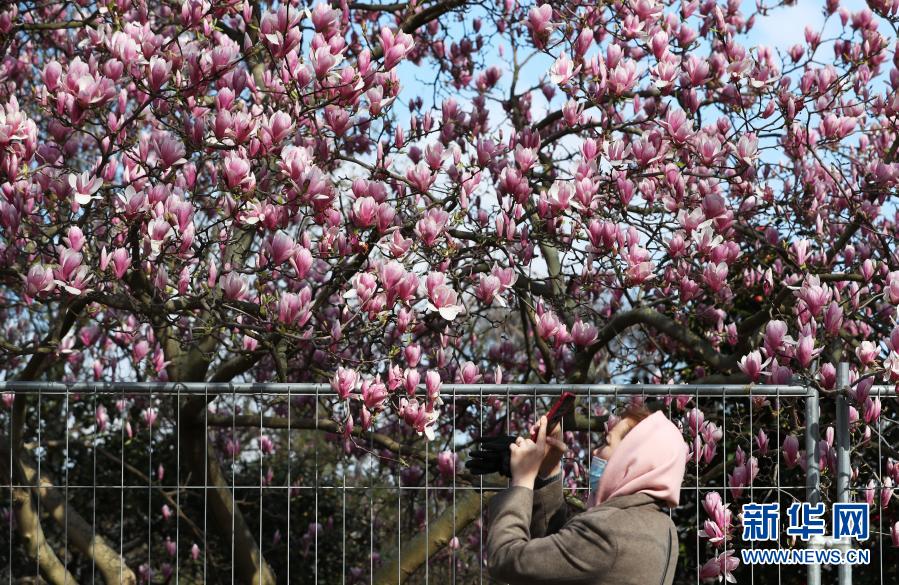 3月19日,在法國巴黎埃菲爾鐵塔腳下的戰(zhàn)神廣場,一名女子拍攝玉蘭花。新華社記者高靜攝