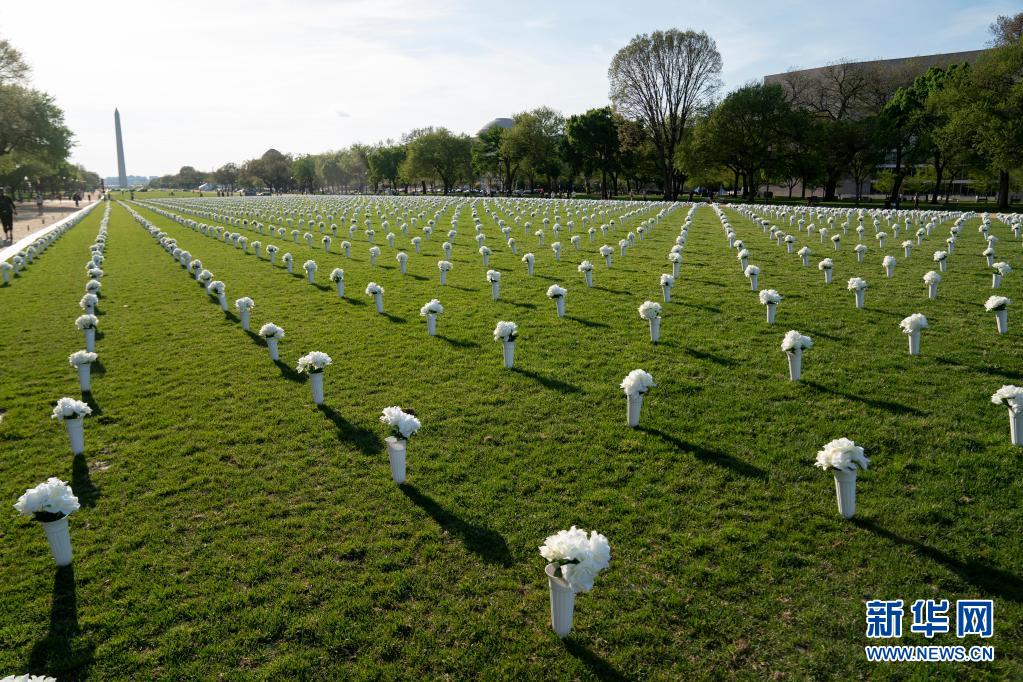 這是4月13日拍攝的美國華盛頓國家廣場草坪上擺放的白色絹花。