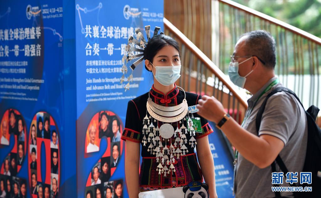 4月18日,身著黎族服飾的志愿者在博鰲亞洲論壇大酒店服務參會人員。