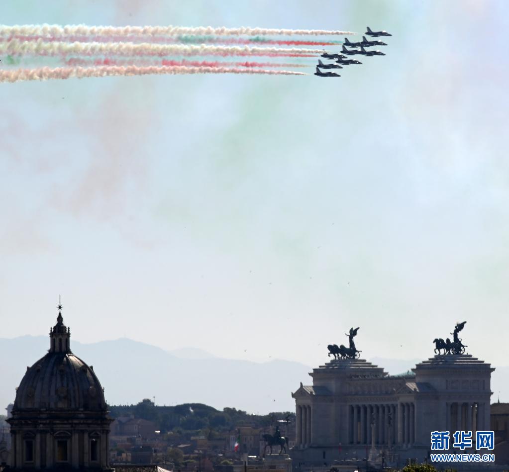 4月25日,意大利“三色箭”飛行表演隊在羅馬舉行的紀(jì)念儀式上噴出代表意大利國旗顏色的紅白綠三色煙霧。