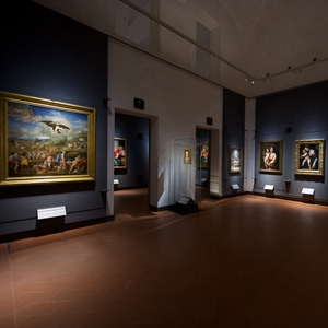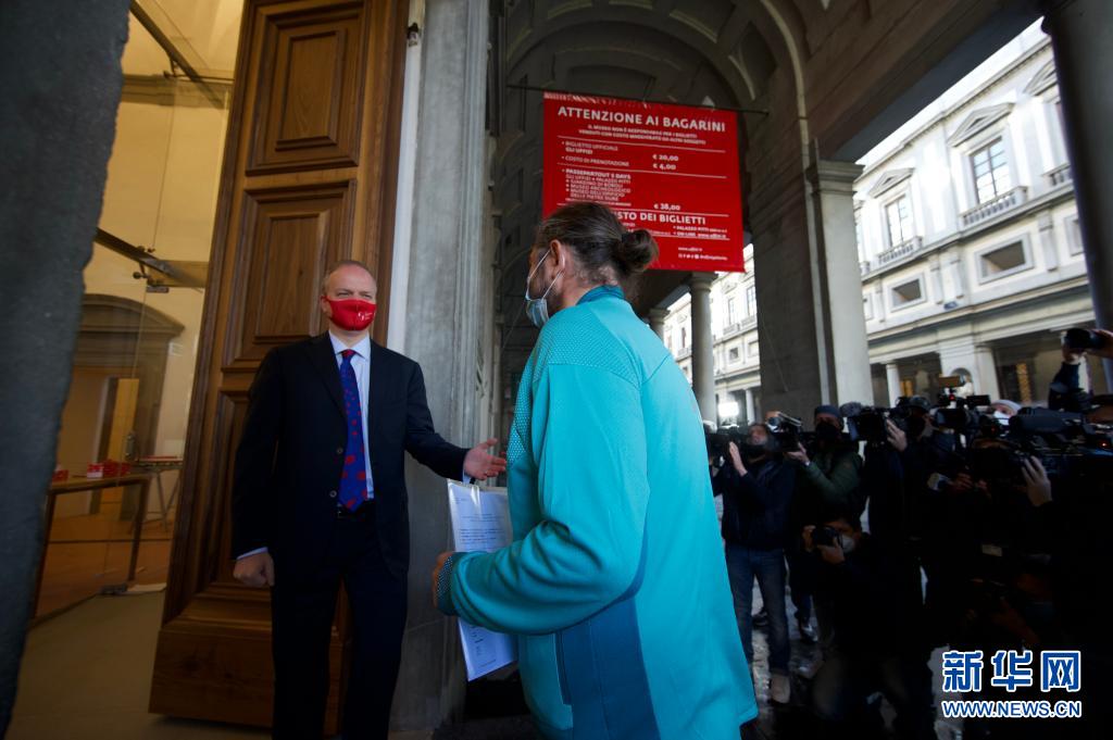 5月4日,在意大利佛羅倫薩,烏菲齊美術館館長施密特(左)在重新開放的美術館門口迎接參觀者。當日,意大利烏菲齊美術館重新開放。美術館改建了售票處和接待處,以避免排隊,并開設了十四個新展室。新華社發(fā)