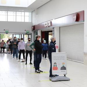 5月10日,人們在愛爾蘭首都都柏林一家重新恢復(fù)營業(yè)的理發(fā)館外排隊。