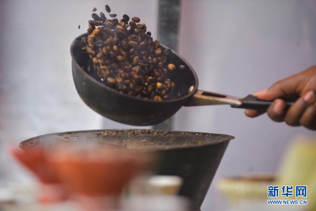 5月14日,商販在埃塞俄比亞亞的斯亞貝巴街頭的咖啡攤炒咖啡豆。