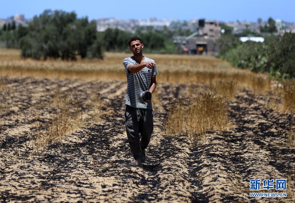 5月22日,在加沙地帶汗尤尼斯,巴勒斯坦農民走在被以色列炮擊燒焦的麥田間。新華社發(fā)(亞西爾攝)