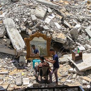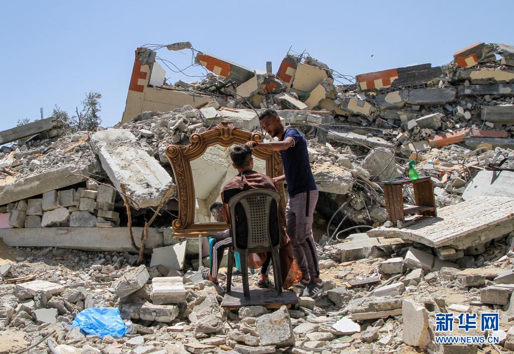 5月26日,在加沙地帶北部的城鎮(zhèn)貝特拉希亞,23歲的巴勒斯坦理發(fā)師阿卜杜拉·扎瓦拉在他被以色列炸毀的房屋前為顧客免費服務(wù)。 新華社發(fā)(里澤克·阿卜杜勒·賈瓦德攝)