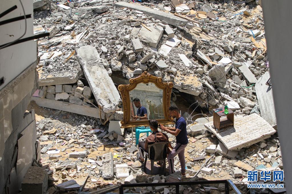 5月26日,在加沙地帶北部的城鎮(zhèn)貝特拉希亞,23歲的巴勒斯坦理發(fā)師阿卜杜拉·扎瓦拉在他被以色列炸毀的房屋前為顧客免費(fèi)服務(wù)?!⌒氯A社發(fā)(里澤克·阿卜杜勒·賈瓦德攝)