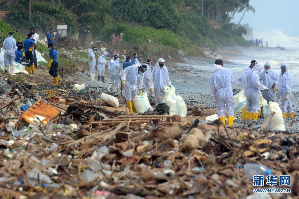 5月27日,安全人員在距離科倫坡30多公里的斯里蘭卡西海岸城市尼甘布清理被海水沖到這里的集裝箱船“X-PRESS PEARL”的碎片。
