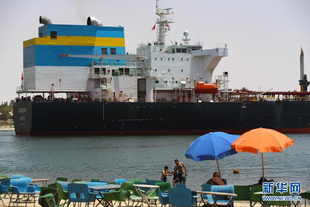 這是5月30日在埃及伊斯梅利亞省拍攝的航行在蘇伊士運(yùn)河上的貨船。
