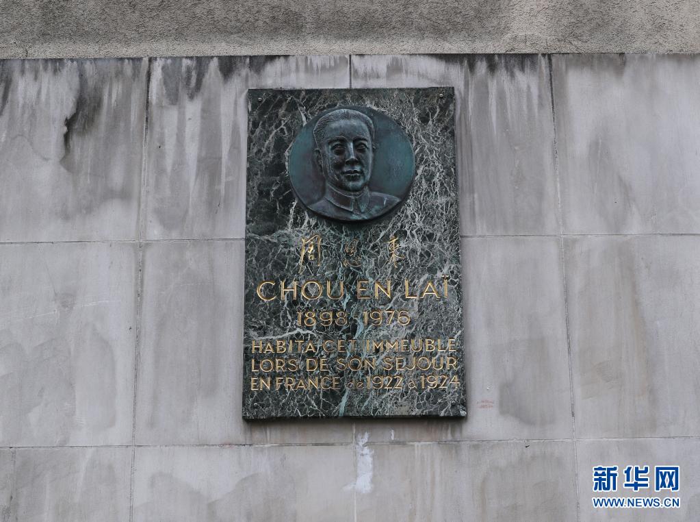這是2021年4月11日在法國巴黎十三區(qū)戈德弗魯瓦街上的“海王星旅館”外拍攝的帶有周恩來頭像浮雕的紀(jì)念牌。新華社記者 高靜 攝