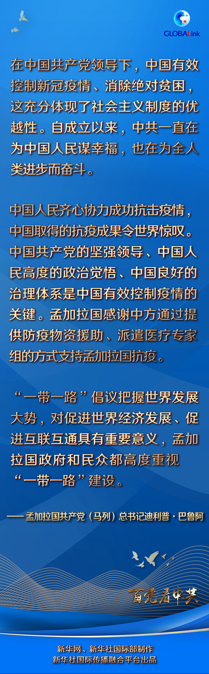 巴魯阿高度評(píng)價(jià)中國(guó)抗擊新冠疫情的顯著成效。他說(shuō),中國(guó)人民齊心協(xié)力成功抗擊疫情,中國(guó)取得的抗疫成果令世界驚嘆。中國(guó)共產(chǎn)黨的堅(jiān)強(qiáng)領(lǐng)導(dǎo)、中國(guó)人民高度的政治覺(jué)悟、中國(guó)良好的治理體系是中國(guó)有效控制疫情的關(guān)鍵。孟加拉國(guó)感謝中方通過(guò)提供防疫物資援助、派遣醫(yī)療專(zhuān)家組的方式支持孟加拉國(guó)抗疫。