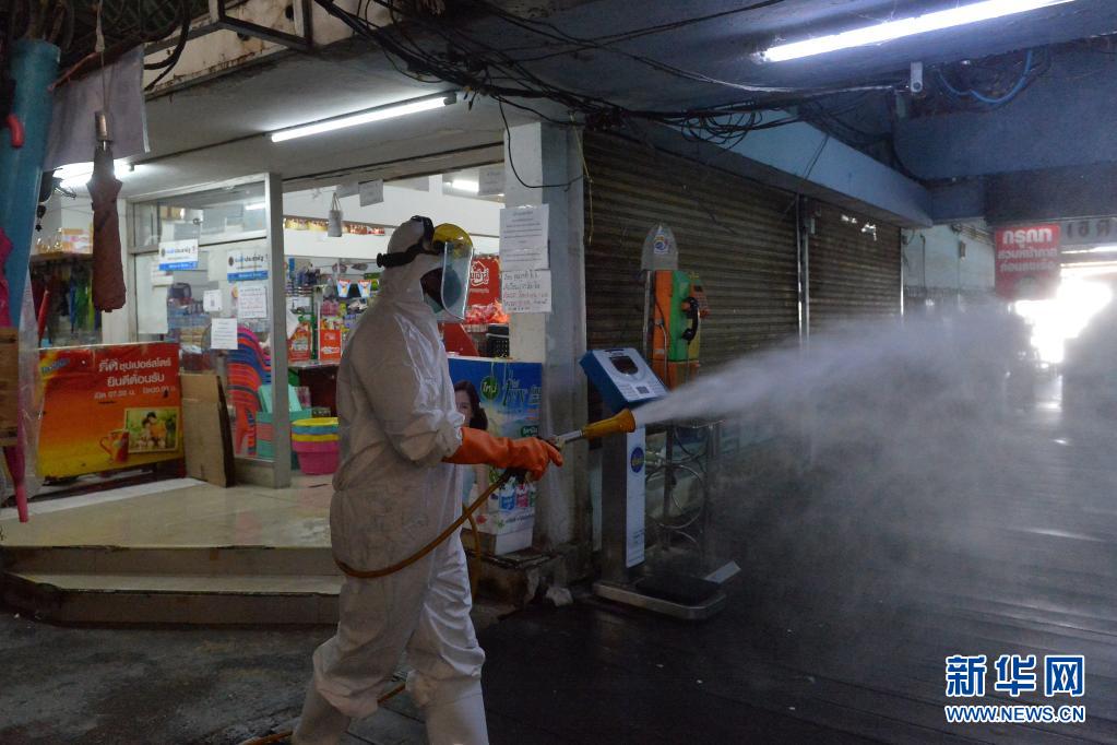 6月21日,工作人員在泰國(guó)首都曼谷一處生鮮市場(chǎng)進(jìn)行消毒。
