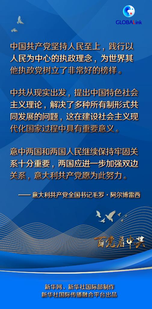 阿爾博雷西說,一百年來,中國共產黨帶領中國人民取得了巨大成就。中共積累的經驗是國際共產主義運動史上的亮點,中共在國際共運歷史上樹立了重要標桿。