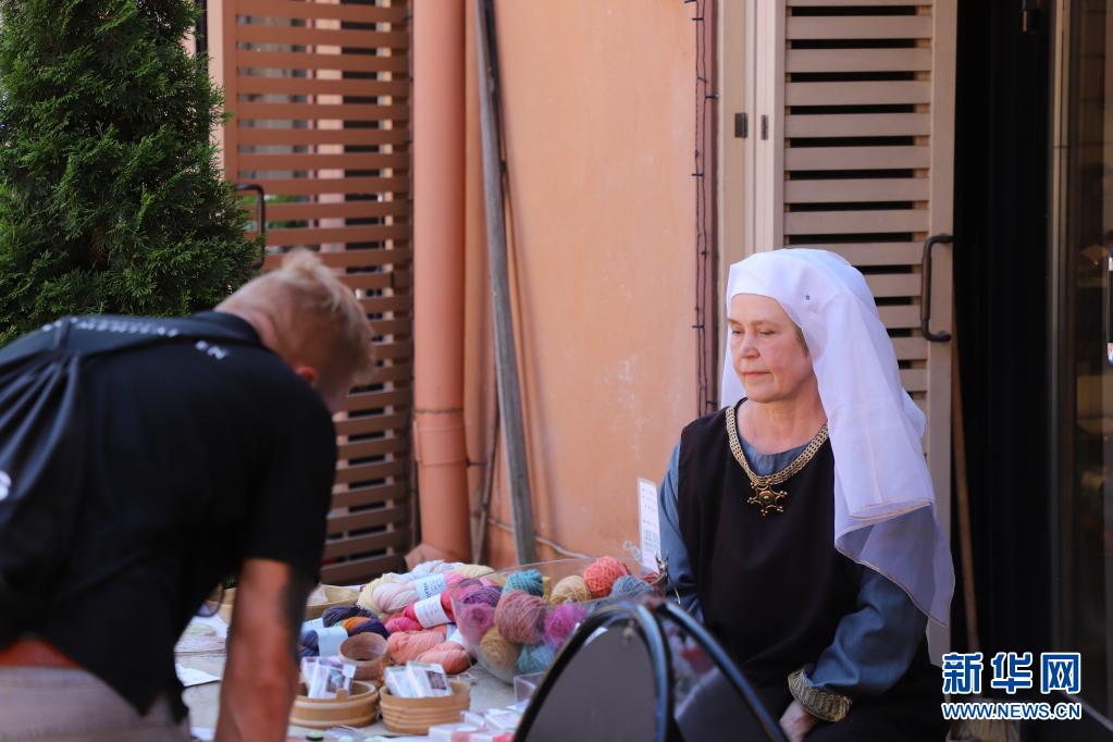7月1日,一名身著中世紀風(fēng)格服裝的攤主在芬蘭圖爾庫舉行的“中世紀市集”上向顧客售賣紀念品。